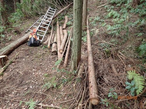 3月4日(土)のことです。 去年伐倒しておいた桧の間伐材を片付けた後で いよいよ今年初めての間伐をしようと倒す木と倒す方向を