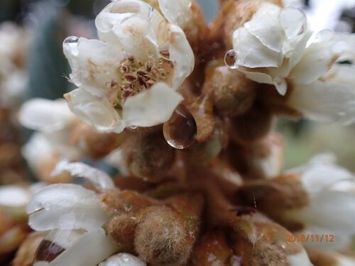 11月12日(月)振休の日のことです。 この日は生憎の雨、ということでミツバチ達はどうしているかな?と 様子を見に行くと、まずは満開の枇杷の花の香りに誘われて