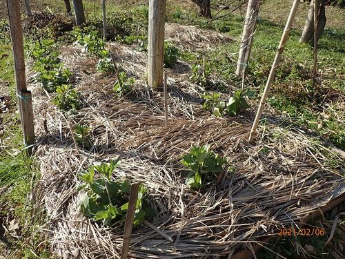 2月6日(土)のことです。 雪にすっぽり覆われた時にはどうなるのかと心配もしましたが、無事に雪解けの下から元気そうなソラマメのお多福ちゃん達が現れてくれました。元気そうなのは