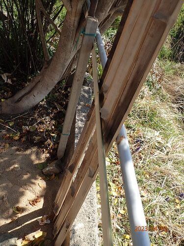 4月2日(日)のことです。 一日目の夕方のこと、作業中の私の所へ近所の人が通り掛かりに立ち寄ってくれました。竹を立てるのは手間が掛かる、自分も経験が有る、と仰っていました。その人曰く、横は2本にして、間に挟む様に取り付けて行くと効率が良い、との…