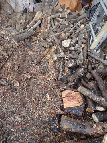 1月21日(日)のことです。 生憎の雨が降っているので、この日は外仕事を諦めて、薪割り小屋で斧での薪割りをすることにしました。運良く、枝の部分の玉切った物が少し残っていました。こんな日の為に少しは残しておく必要が有ります。