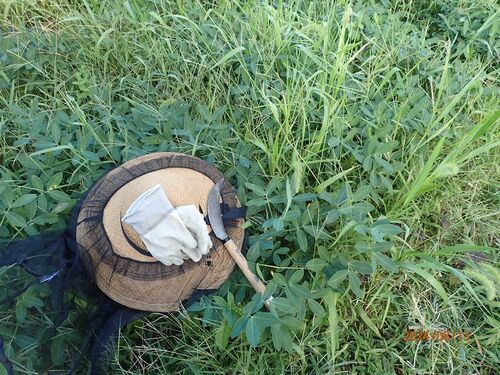 8月13日(火)のことです。 夕方の草刈りがもう少し出来そうなので、こちらもやっておくことにしました。落花生畑です。こちらはそろそろ根を降ろす頃だと思われます。それなのに、こんなに雑草が生い茂っていては降ろし難いでしょう。