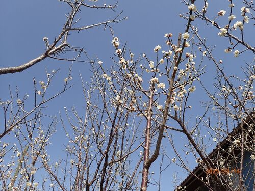 3月14日(金)のことです。 この日は朝から山へ伐木の引取りに行きました。午前中の部を終了し、家に帰ってから、庭を見ると、梅の花が満開でした。今年は寒かったせいか、開花が遅れた様に思えます。梅の花を愛でようと近づくと、