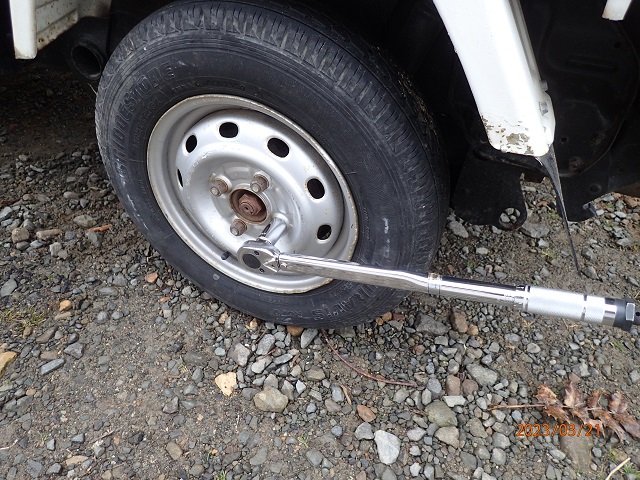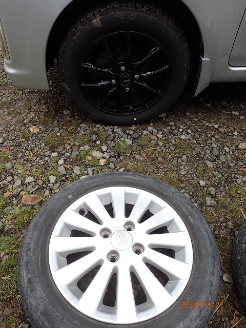 お彼岸の用事を諸々済ませて、時間が有ったのでサン婆ーちゃんのタイヤ交換をしておくことにしました。もういくら何でも、積雪までは行かないでしょう。週末には山へ伐採にも行く予定にしているし、